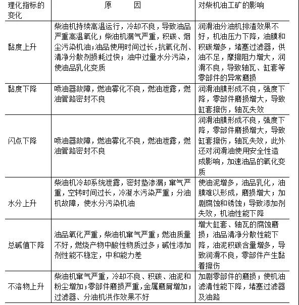 柴油机油常规理化指标变化与柴油机故障的关系如下: