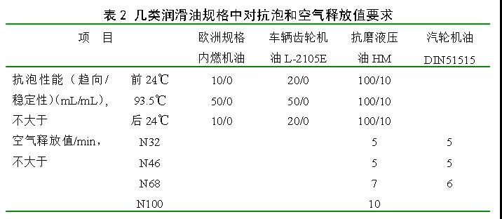 在润滑油中的空气有三种存在形式:自由空气、进入空气和溶解空气。其中溶解空气由于系统的温度和压力变化时使溶解度下降,溶解空气析出,在润滑油 表面形成泡沫,在润滑油中形成微泡,就会有危害。有些润滑油规格中专门有 “空气释放值”和“抗泡性能”指标,改善这两个指标的添加剂往往有相反作用,配方中要找到一个平衡点。几类润滑油规格中对抗泡和空气释放值要求见下表: